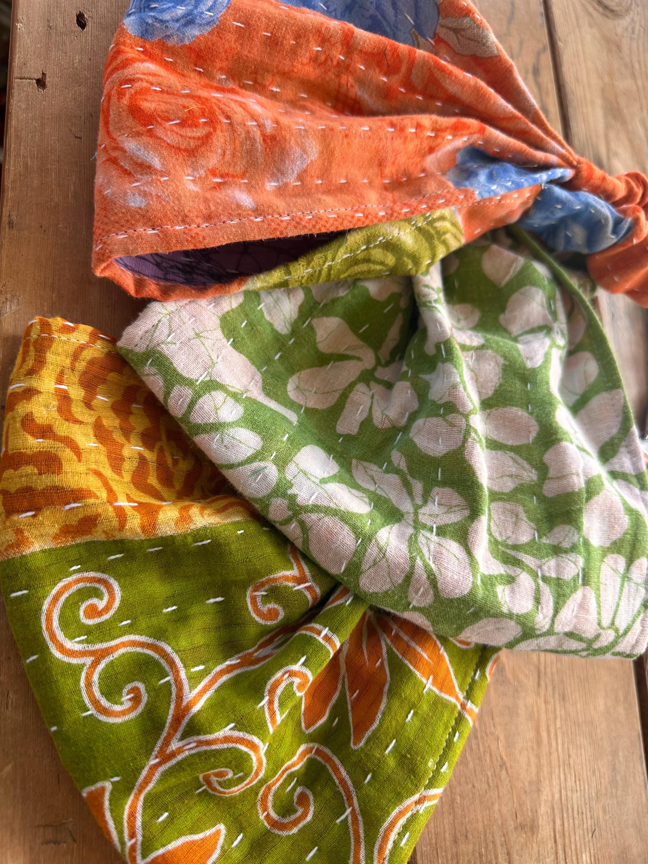 “A wrapped head is a wise head." These head wraps are made from vintage kantha fabrics. All vary slightly. Please see available patterns in the product write up section on last page of pictures.