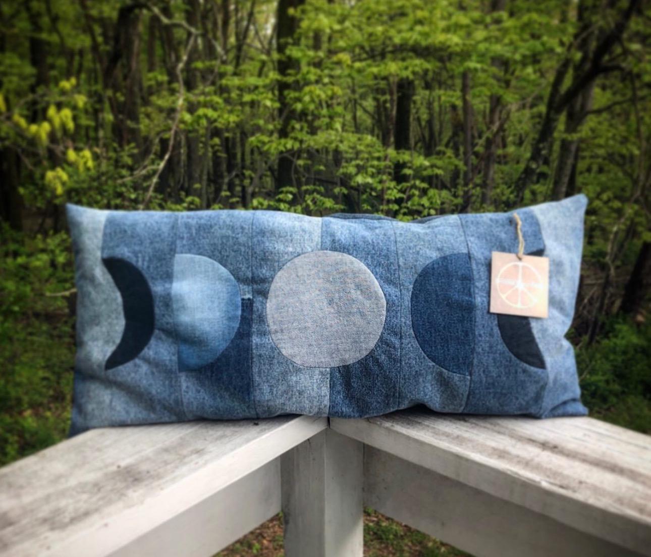 Made from recycled denim, moon cycles are sewn into the pillow, not appliqué.